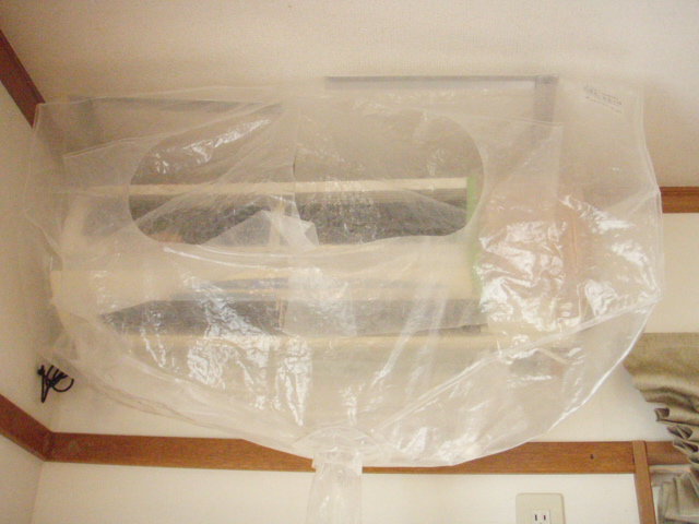 クリーニング作業の前に、基盤などに水が掛からないようビニールで養生します。